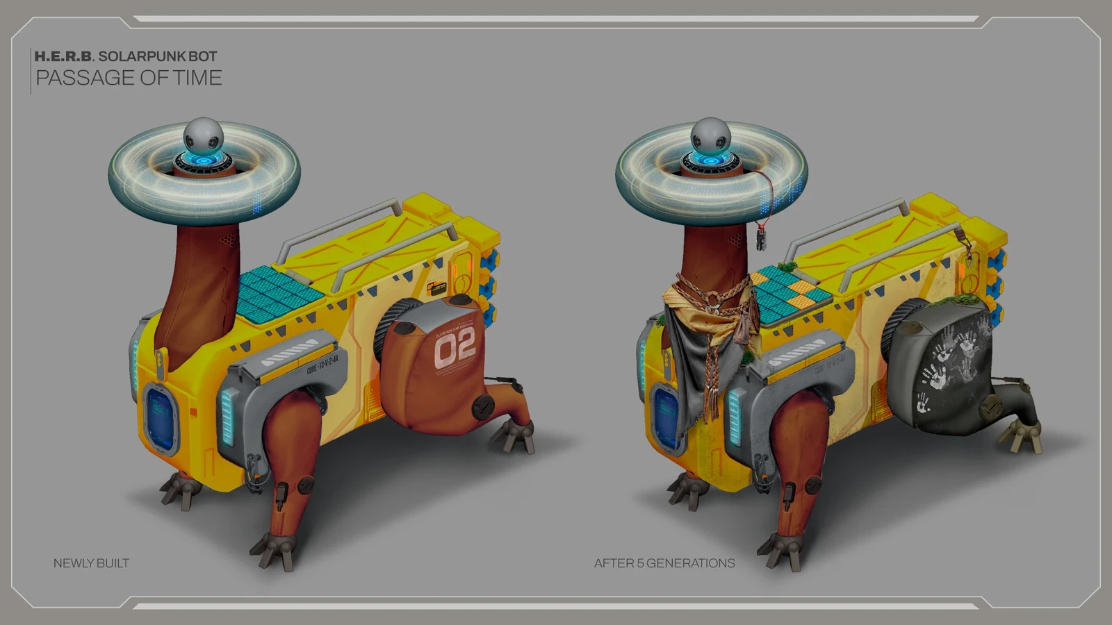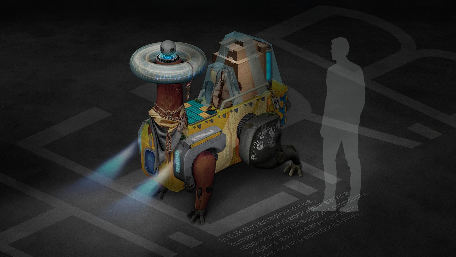 In a future where communities prioritize collective care and their relationship with the environment, HERB is an autonomous service robot designed to assist with daily delivery and maintenance tasks. However, its primary function is not transportation, but rather the preservation of the living memory of the territory.